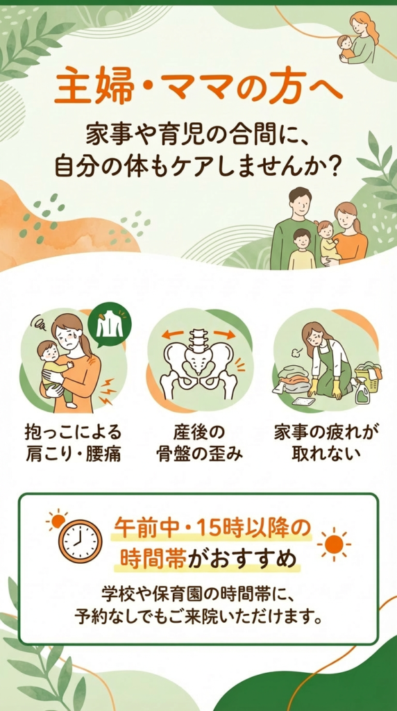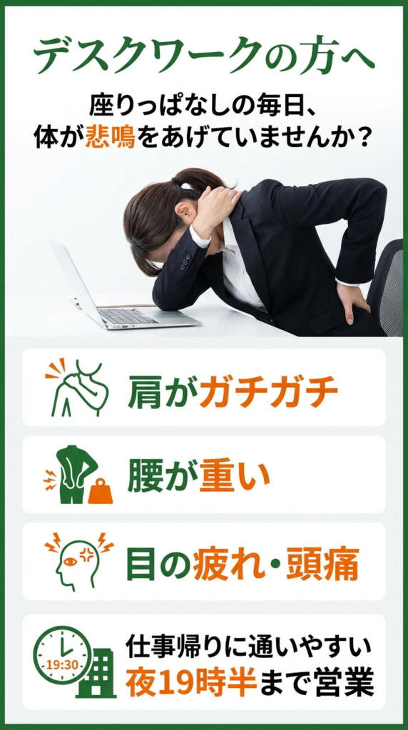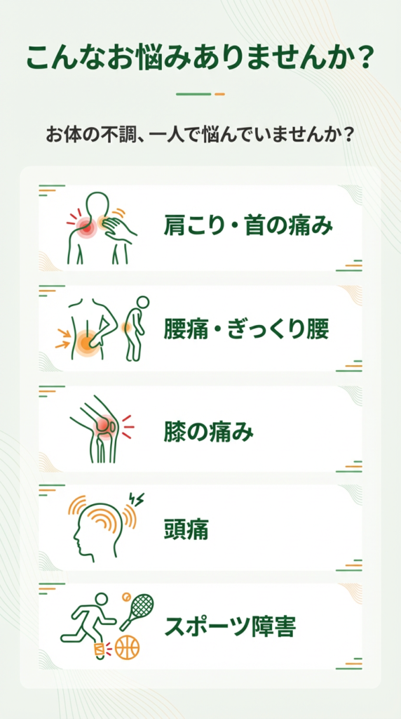 肩こり・腰痛をはじめ、首や背中の不調まで幅広く対応。